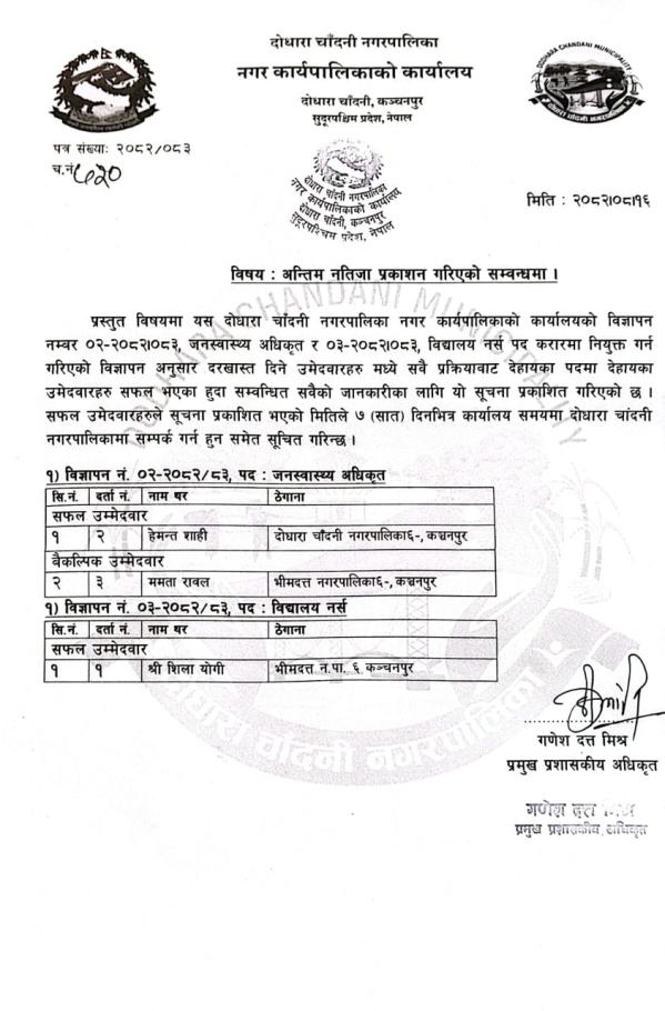 अन्तिम नतिजा प्रकाशन सम्बन्धमा।
