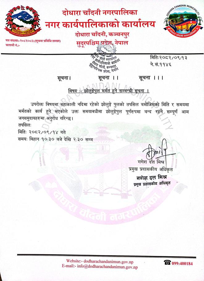 महाकाली नदिमा रहेको झोलुङ्गे पुल बन्द हुने सम्बन्धि सूचना ।