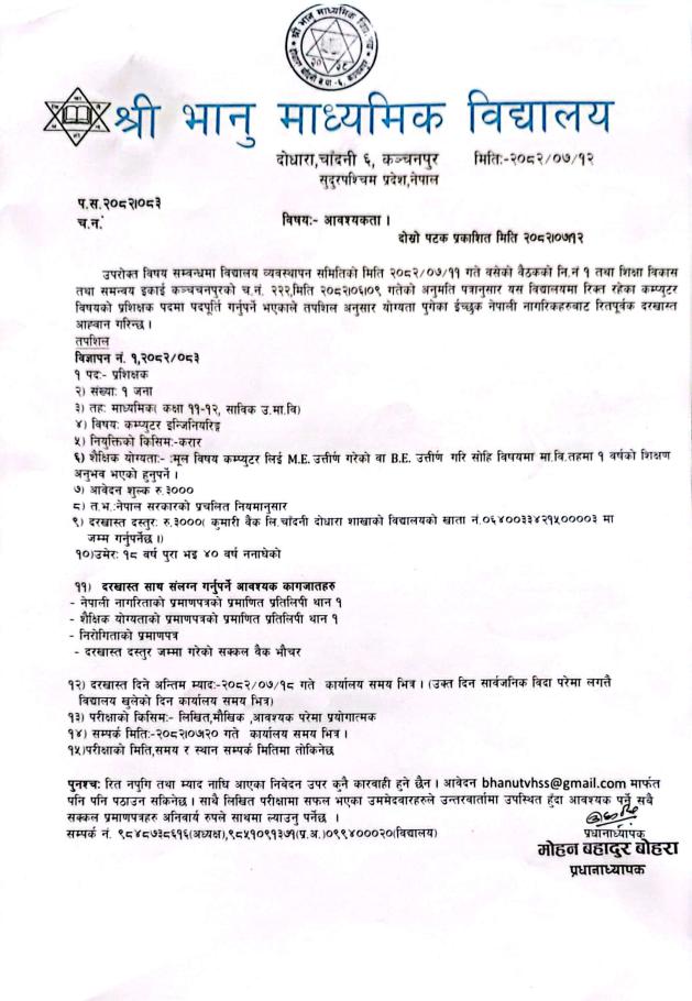 » शिक्षक आवश्यकता सम्बन्धि सूचना ।