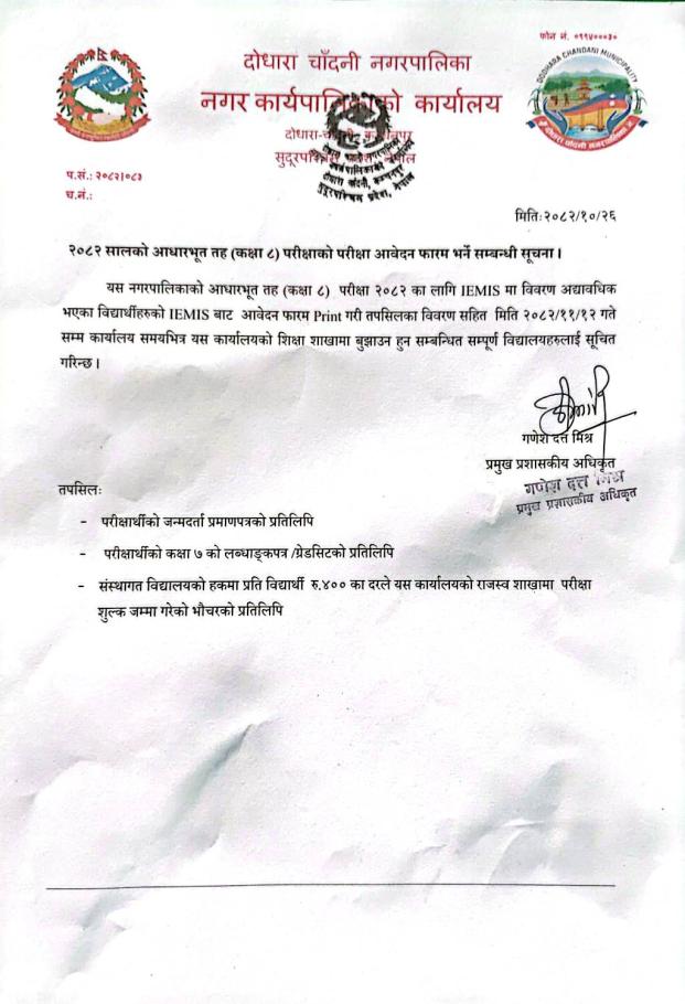 २०८२ सालको आधारभूत तह (कक्षा ८) परिक्षा आवेदन फारम भर्ने सम्बन्धि सूचना ।