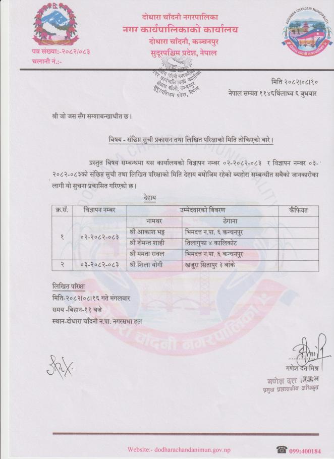 » संक्षिप्त सूचि प्रकाशन तथा लिखित परिक्षाको मिति तोकिएको सूचना ।